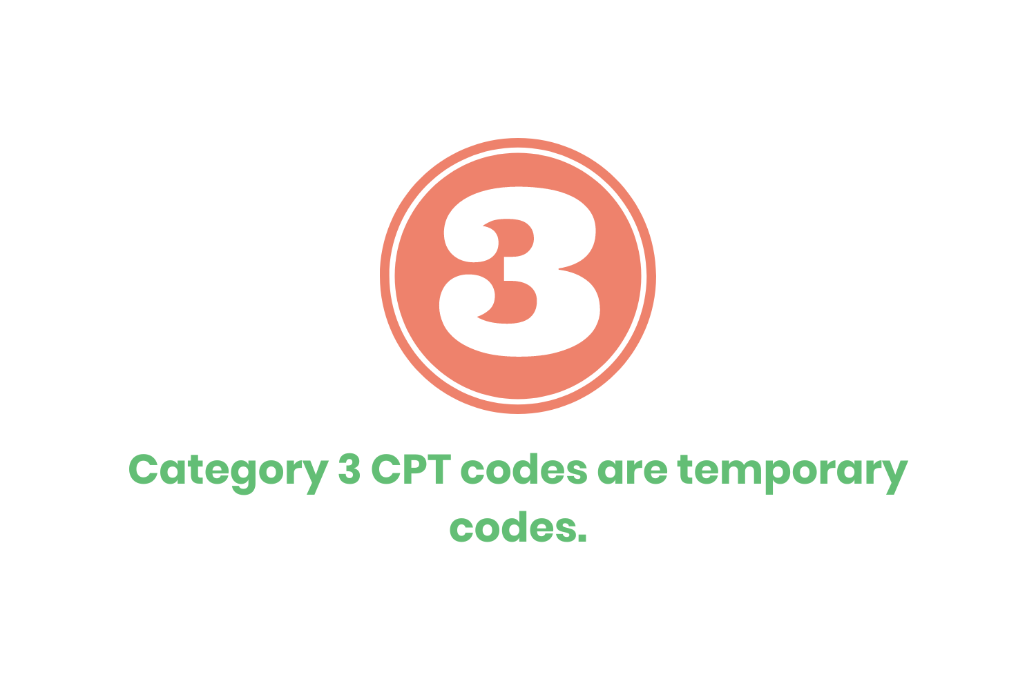 Category 3 CPT codes are temporary codes. “Temporary” in this case suggests these codes will move out of this category (ideally), and get reassigned to category 1. These codes represent new technologies, services, and procedures. They can stay in category 3 for up to 5 years.