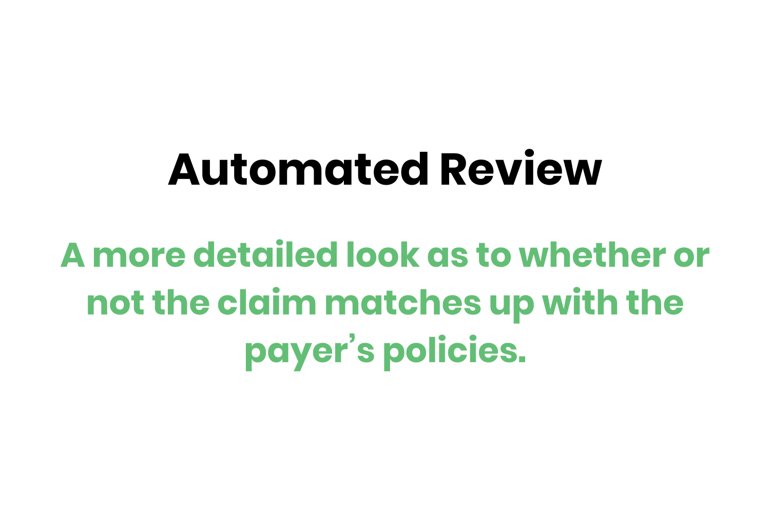The automated review step takes a more detailed look as to whether or not the claim matches up with the payer’s policies. More specifically, this step looks for whether or not…