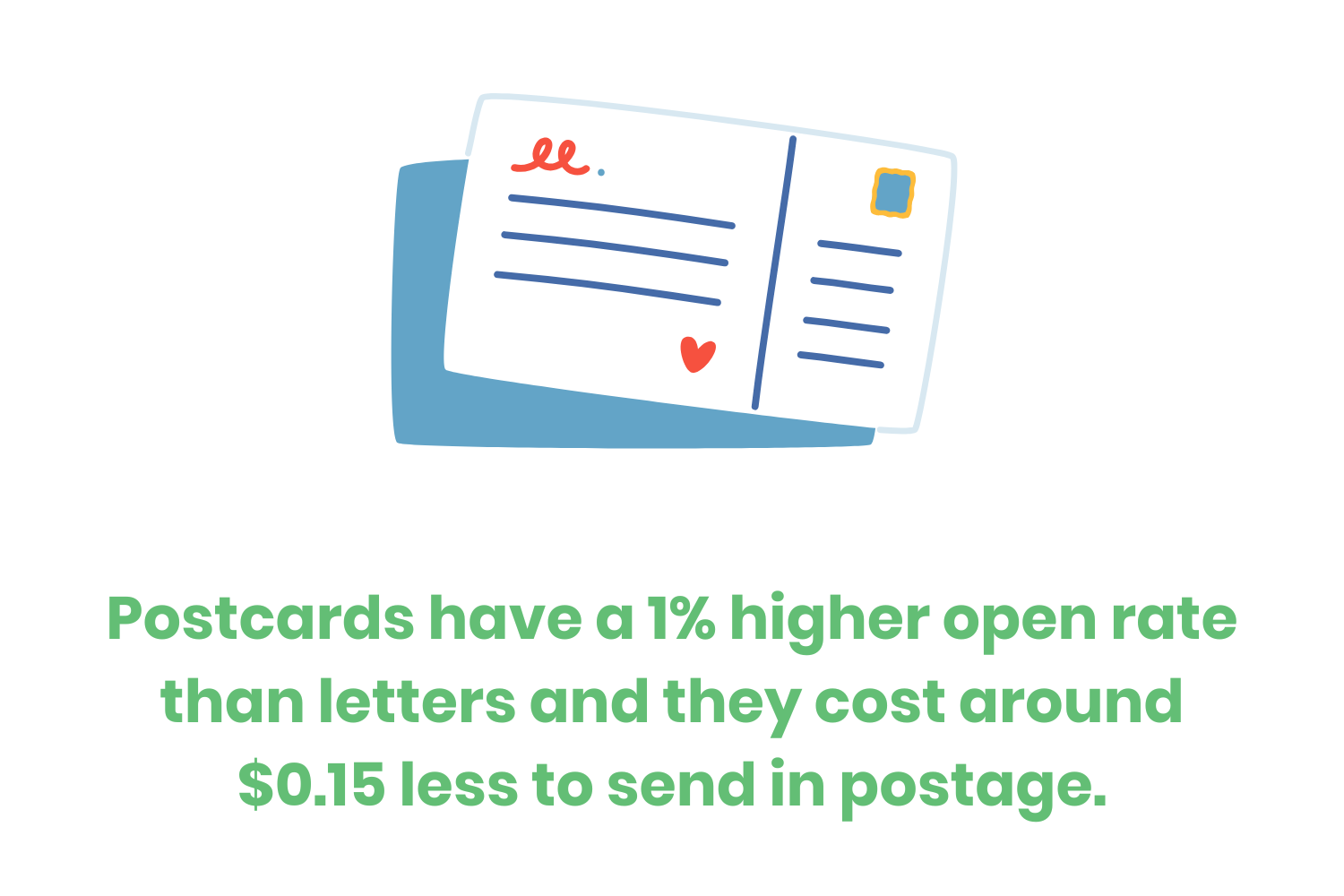 Here are the facts. Postcards have a 1% higher open rate than letters and they cost around $0.15 less to send in postage.