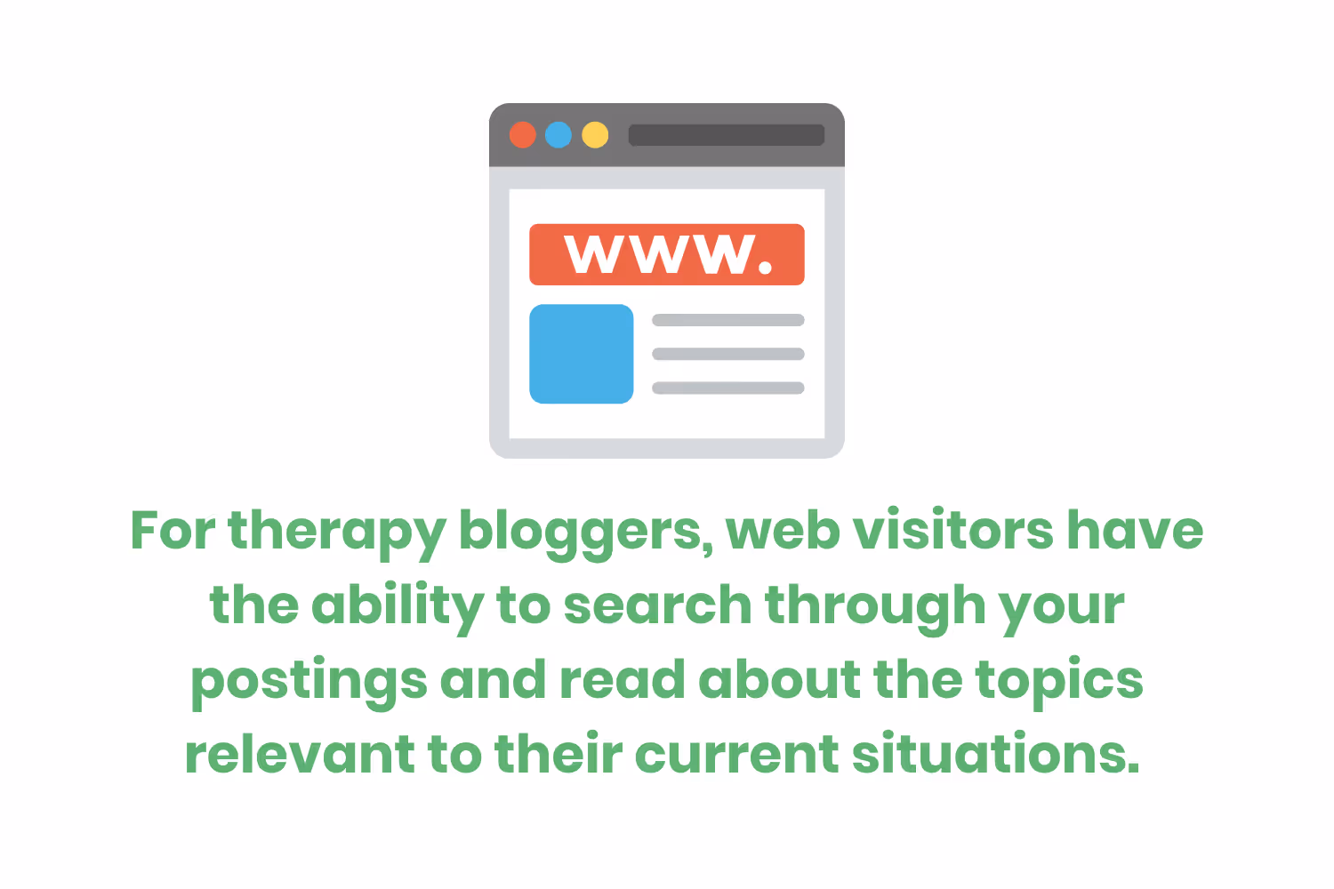For therapy bloggers, web visitors have the ability to search through your postings and read about the topics relevant to their current situations. This may encourage them to reach out to you further.