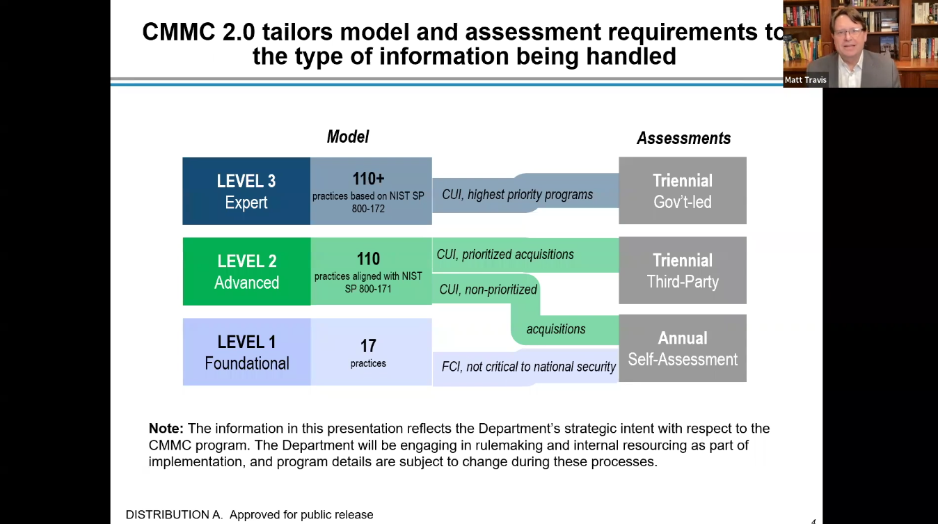 “Ultimately, the things that give me pause on 2.0, I think there might be some false hope out there that since the Delta 20 are gone, things are cheaper and easier. I don’t think that’s necessarily the case.” She continued, “Additionally, I don’t feel as though we have a clear picture on CUI and the delineation between those at level 2” She was referencing the proposed bifurcation of self-assessments versus third-party assessments in CMMC 2.0.