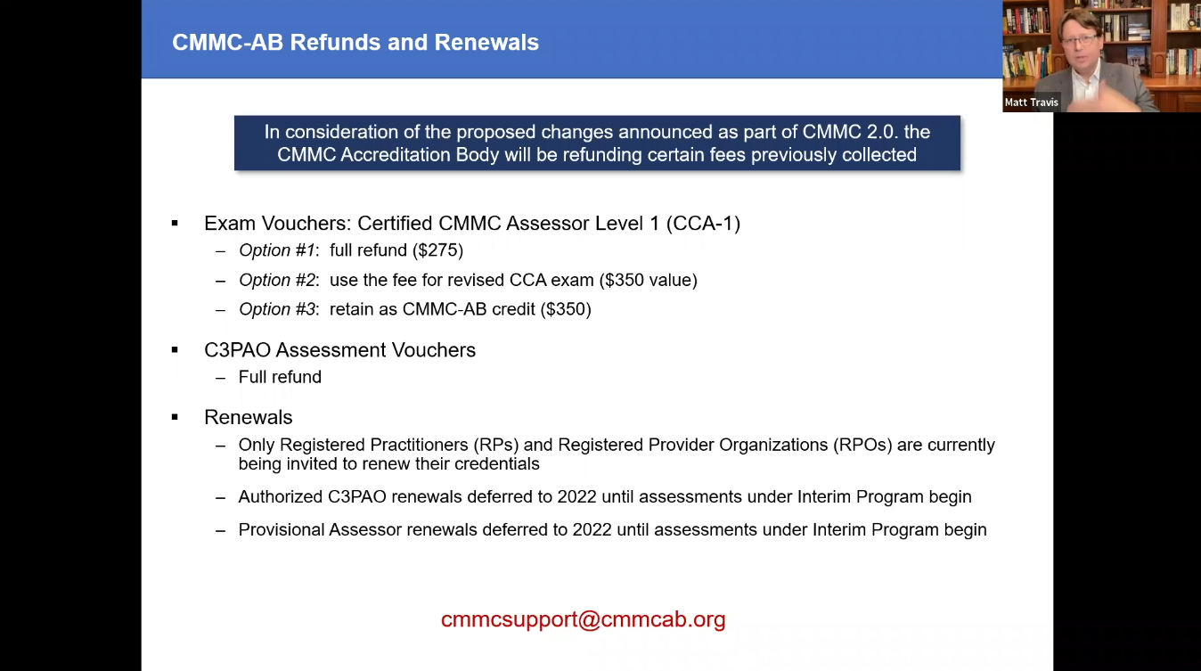 Matthew Travis started his update by addressing refunds for members of the ecosystem affected by the proposed changes of CMMC 2.0.