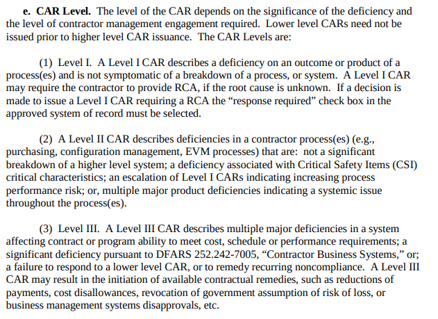 There are four levels of Corrective Action Requests (CARs) referenced in DCMA Manual 2303-04.