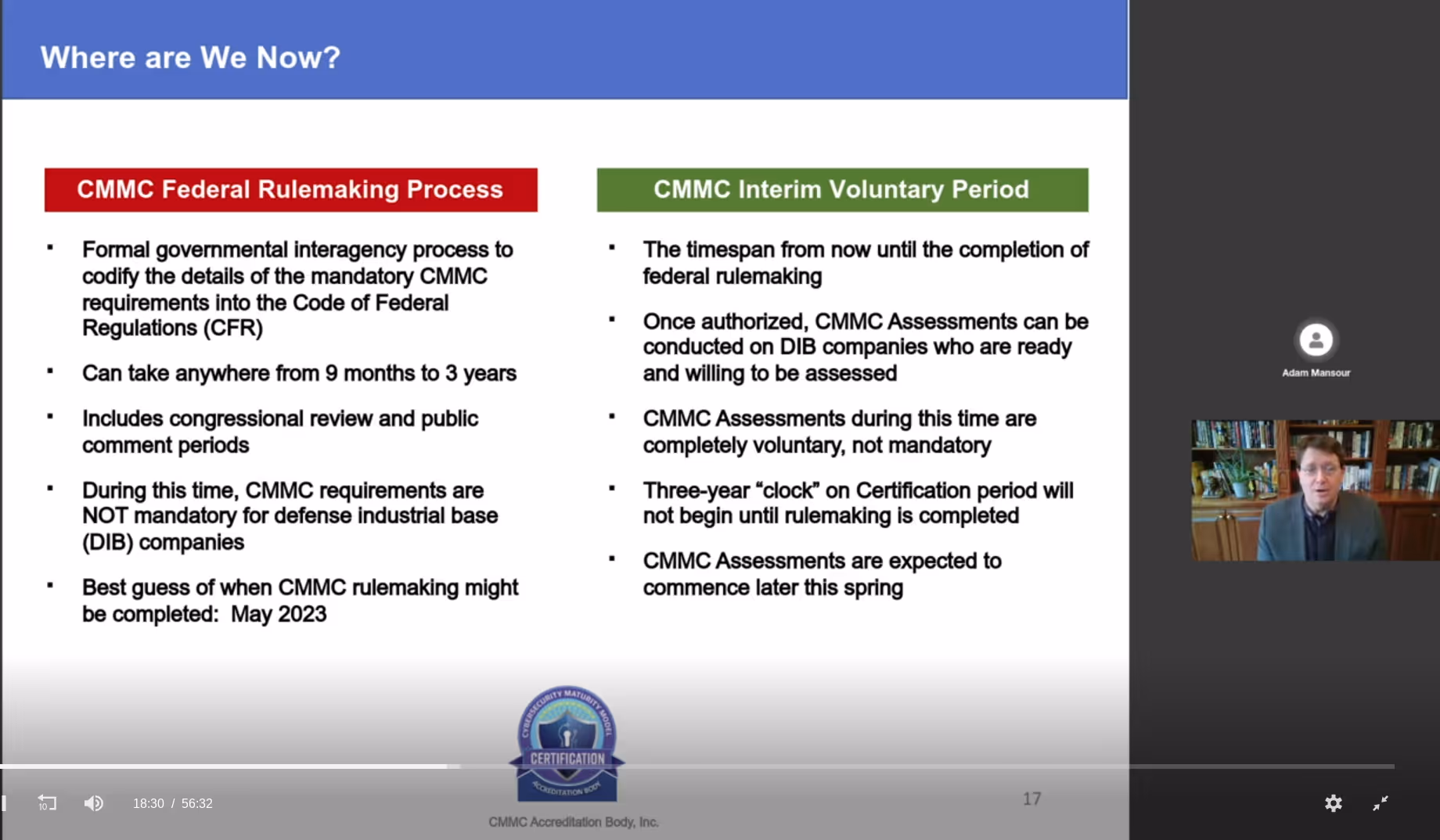 On a separate webinar earlier in March, Matt had discussed his opinion on the CMMC 2.0 rollout over the coming years. He stated with the voluntary assessment program. He he believes it will begin later this spring or summer.