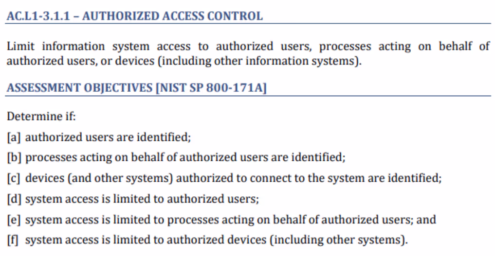 Determination statements express assessment objectives related to the practice. For example, practice AC.L1-3.1.1 contains six objectives: