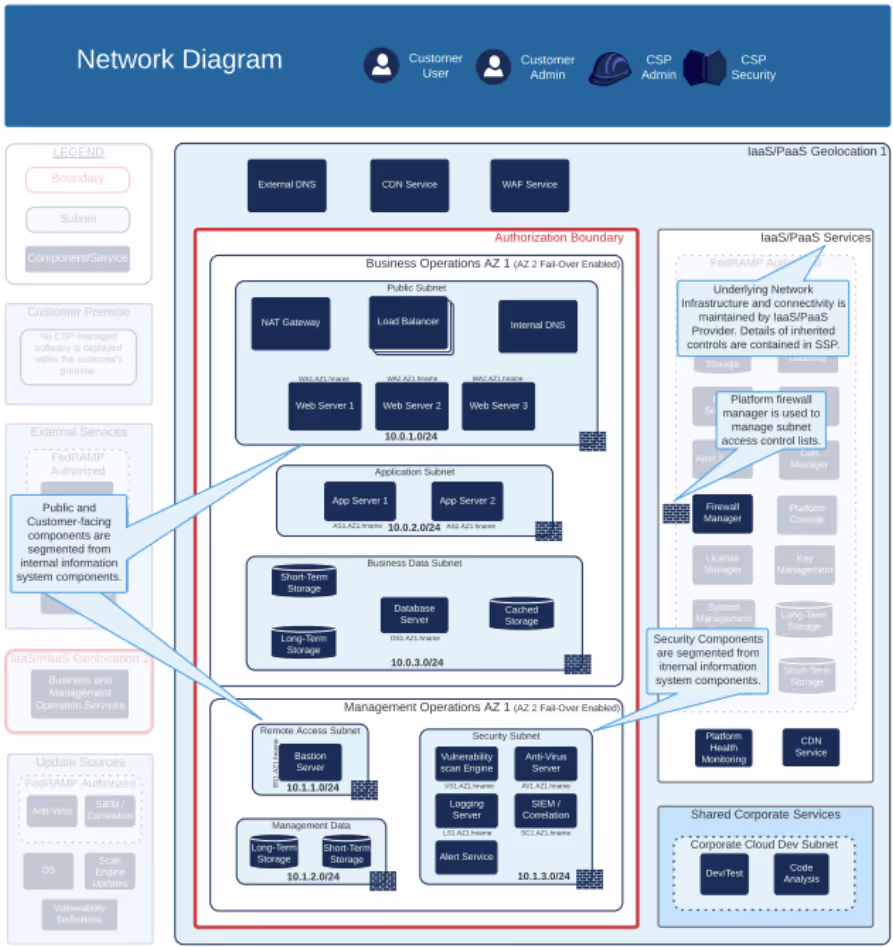 Although informative, the FedRAMP guidance sets a very high bar. NIST provides another notional depiction of a network diagram as seen below. This simplified diagram bears closer resemblance to the network diagram created by KNCSS.