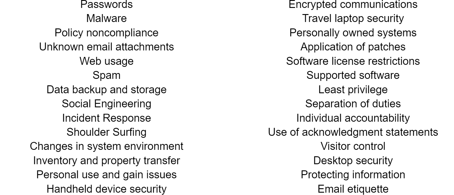 Section 4.1.1 from NIST SP 800-50 lists topics covered through awareness campaigns, including…