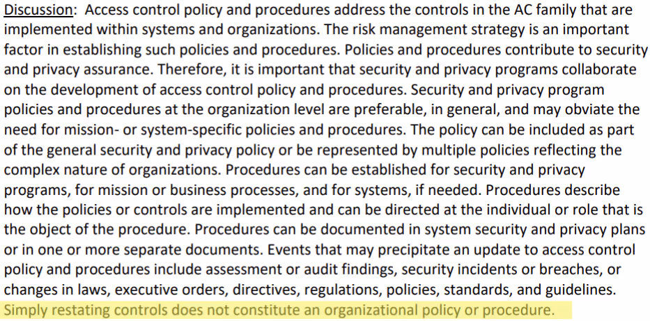 You should strive to keep policies as simple as possible. Let’s review the discussion from NIST SP 800-53 under AC-1: