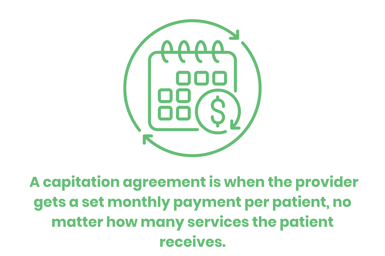 A capitation agreement is when the provider gets a set monthly payment per patient, no matter how many services the patient receives. This prepaid arrangement covers a broad range of services.