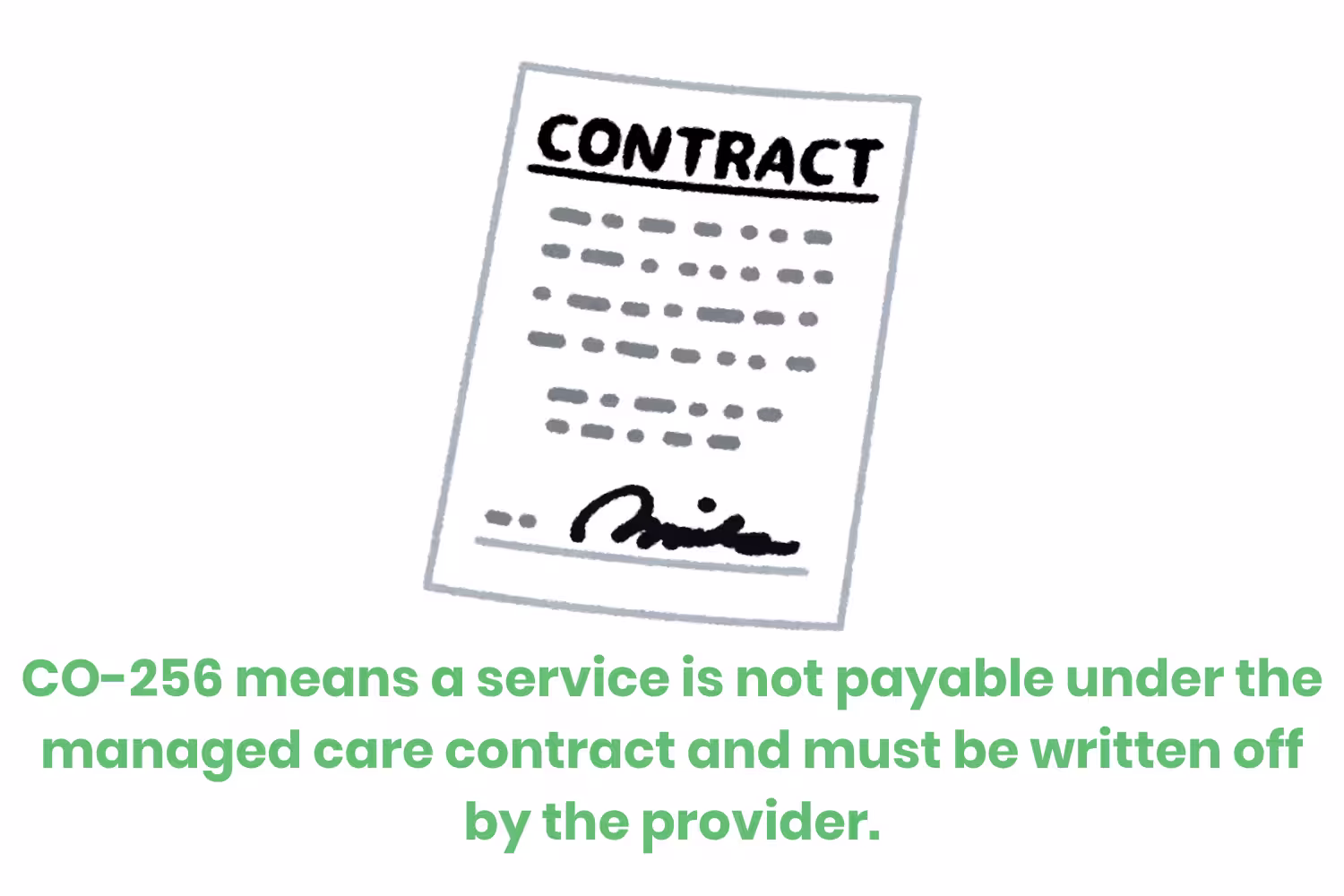 The CO 256 code, also referenced as denial code 256 is an adjustment reason code that is used with group code CO. The presence of code CO means the adjustment is a contractual obligation that must be written off by the healthcare provider and cannot be billed to the patient as out-of-pocket expenses.