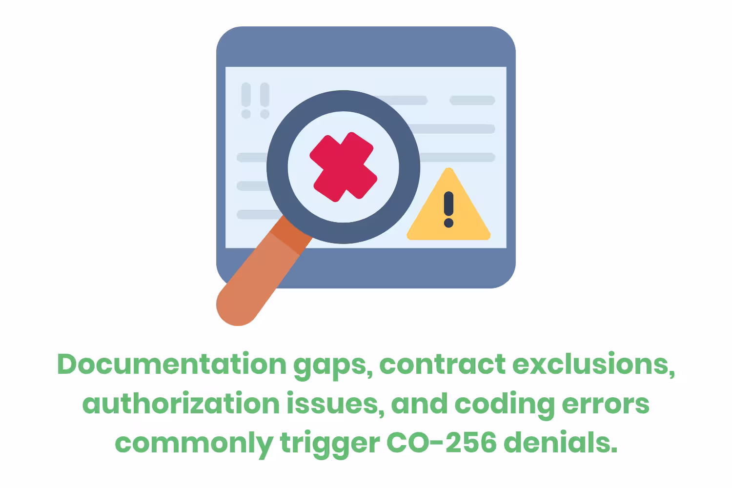 One of the most frequent causes of CO 256 denials is insufficient documentation supporting the medical necessity of the service. Even when care is clinically appropriate, missing or incomplete documentation in the medical records can lead to a denial.