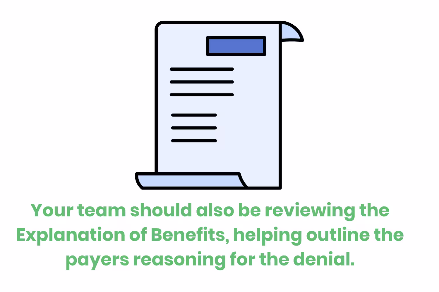 The first thing your team should do when receiving the denial code is review the denial code itself and the original claim. Your team should also be reviewing the Explanation of Benefits, helping outline the payers reasoning for the denial. This can help you initially identify the specific reason for the code and try to find where in the claim it occurred.