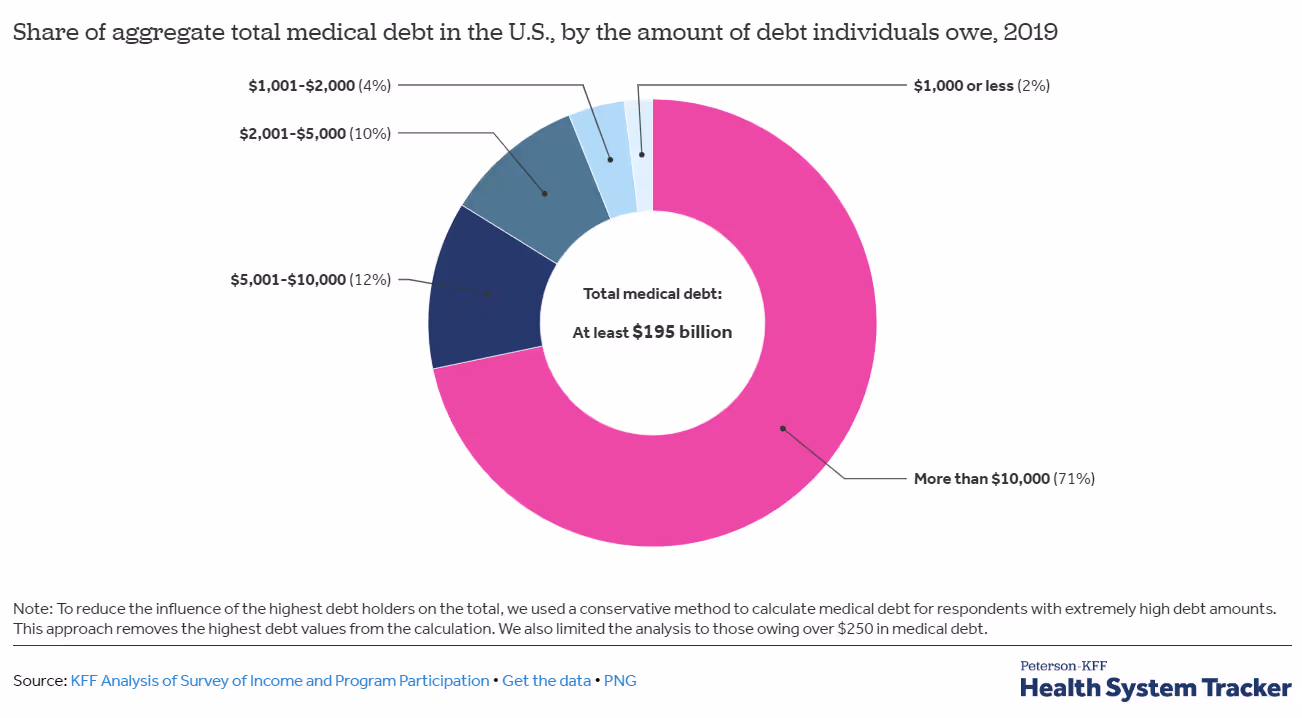 A recent study by KFF suggests that as of 2019, nearly 23 million Americans owe a significant amount of medical debt. That amounts to 1 in 10 adults!