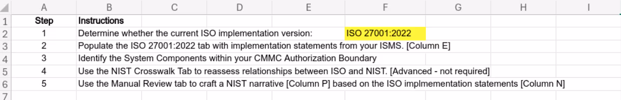Our ISO/IEC 27001 Crosswalk to NIST SP 800-171A will help you complete the gap assessment. The Instructions tab outlines the five steps to complete this crosswalk.
