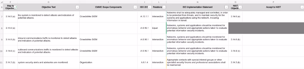 In the example shown below, 3.14.6(a) maps to two corresponding ISO/IEC controls. The relationship to A.13.1.1 is a strong intersection. The relationship to A.8.16.1 is equal. Row 8 is blank in columns G and I indicating a duplicated NIST objective in the row above. Row 8 is also grayed out in columns O and P to show the narrative for 3.14.6(a) belongs in cell P7.