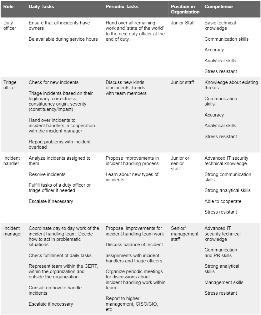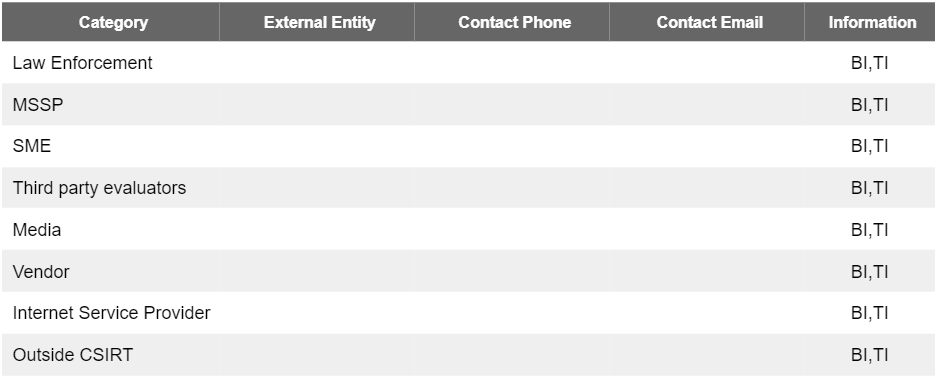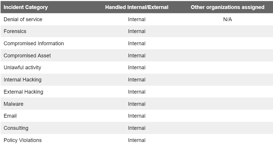 We categorize incidents using the CSIRT Case Classifications. The Forum of Incident Response and Security Teams (FIRST) manages this publication. We created categories in our plan to identify who handles these categories. We identify any external organizations who handle incidents on our behalf.