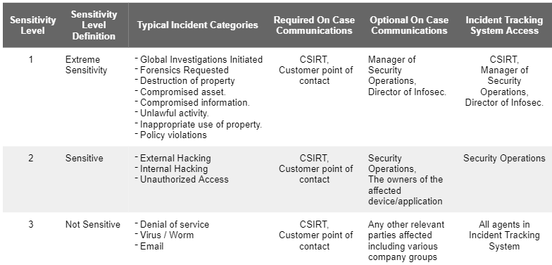 Incident managers apply the “need to know” when communicating case details. The sensitivity matrix classifies cases according to sensitivity levels.