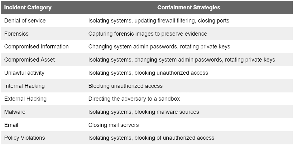 Containment strategies vary based on the type of incident and assessed impact. Criteria for determining the appropriate strategy includes: