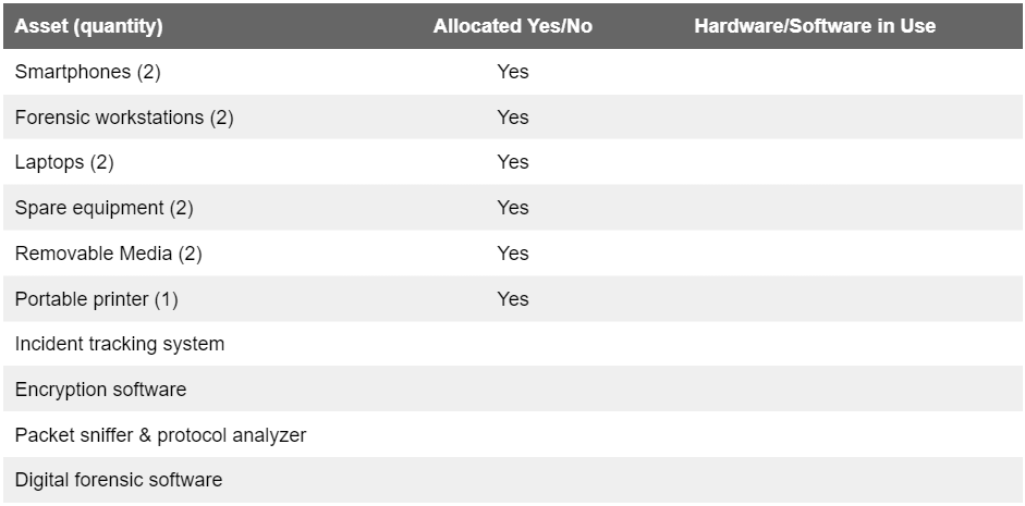 We outfitted each incident response team with a jump kit. The jump kit contains many of the same materials listed above and is ready to go at all times. The laptop performs packet sniffing, malware analysis, and other actions that risk contamination. We reinstall all software software applications before using it for another incident.