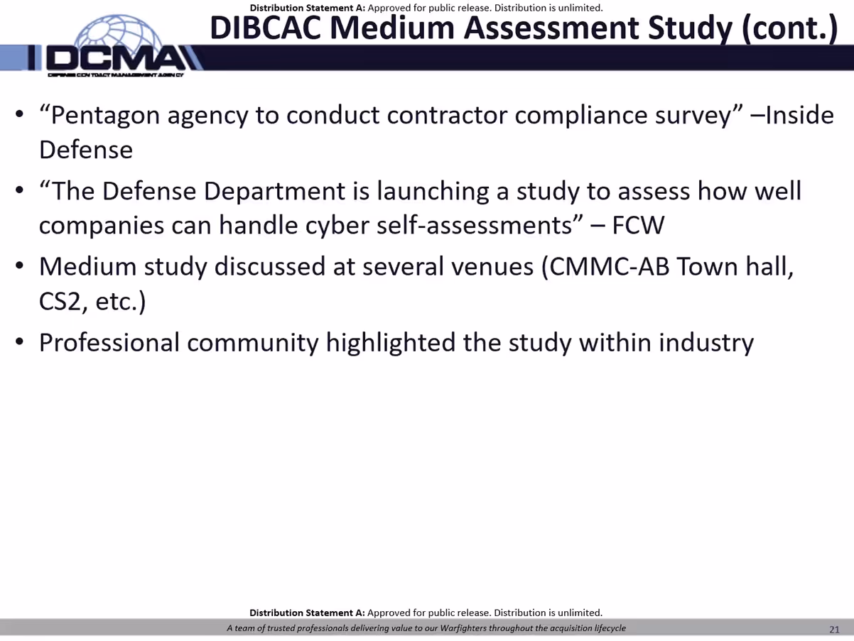 DIBACCO's parent is The Defense Contract Management Agency (DCMA). In March of 2022, they announced they would start conducting medium assessments. As reported by FCW, the goal is to better understand "the level of compliance... with smaller companies who compose the majority of the DIB".
