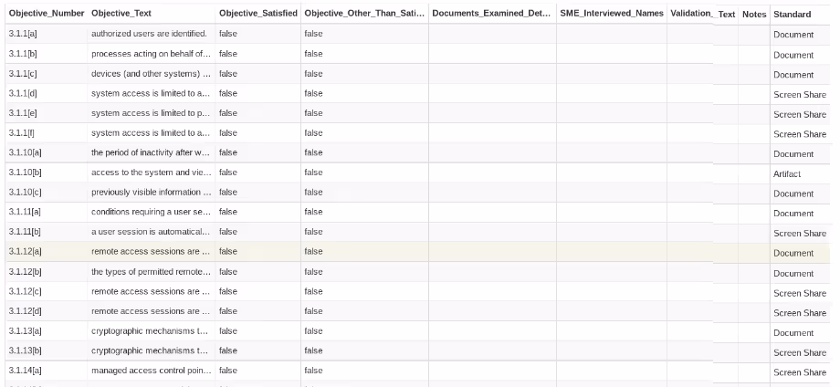 We presume the workflow would begin with marking the objective table as “true” if satisfied or "false" if it is other than satisfied. There are also columns representing documents and persons interviewed.  This leads us to believe the last column entitled Validation_Text may relate to observations made or tests performed. Next is a column for any notes taken. The last column, “Standard” has values that may list the type of desired evidence for each objective. These values include document, screen share, and artifact.