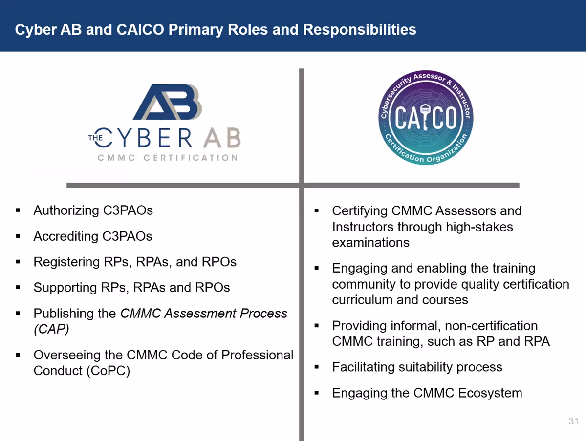 The CyberAB will continue to accredit C3PAOs and support consultants. They will also publish the CMMC Assessment Process (CAP) and oversee the CMMC Code of Professional Conduct (CoPC). The CAICO will take over responsibilities associated with certifying assessors and instructors. They will also provide non-certification CMMC training for consultants and conduct suitability processes.