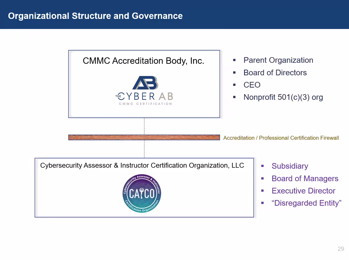The Cyber AB introduced the Cybersecurity Assessor & Instructor Certification Organization (CAICO). The CAICO is a new entity in the CMMC ecosystem that will certify assessors and instructors. Kyle Gingrich will lead this entity as the interim Executive Director working for a Board of Managers. They plan to launch a website in Q1 of 2023 along with new branding, encrypted badges and new partner enablement tools.