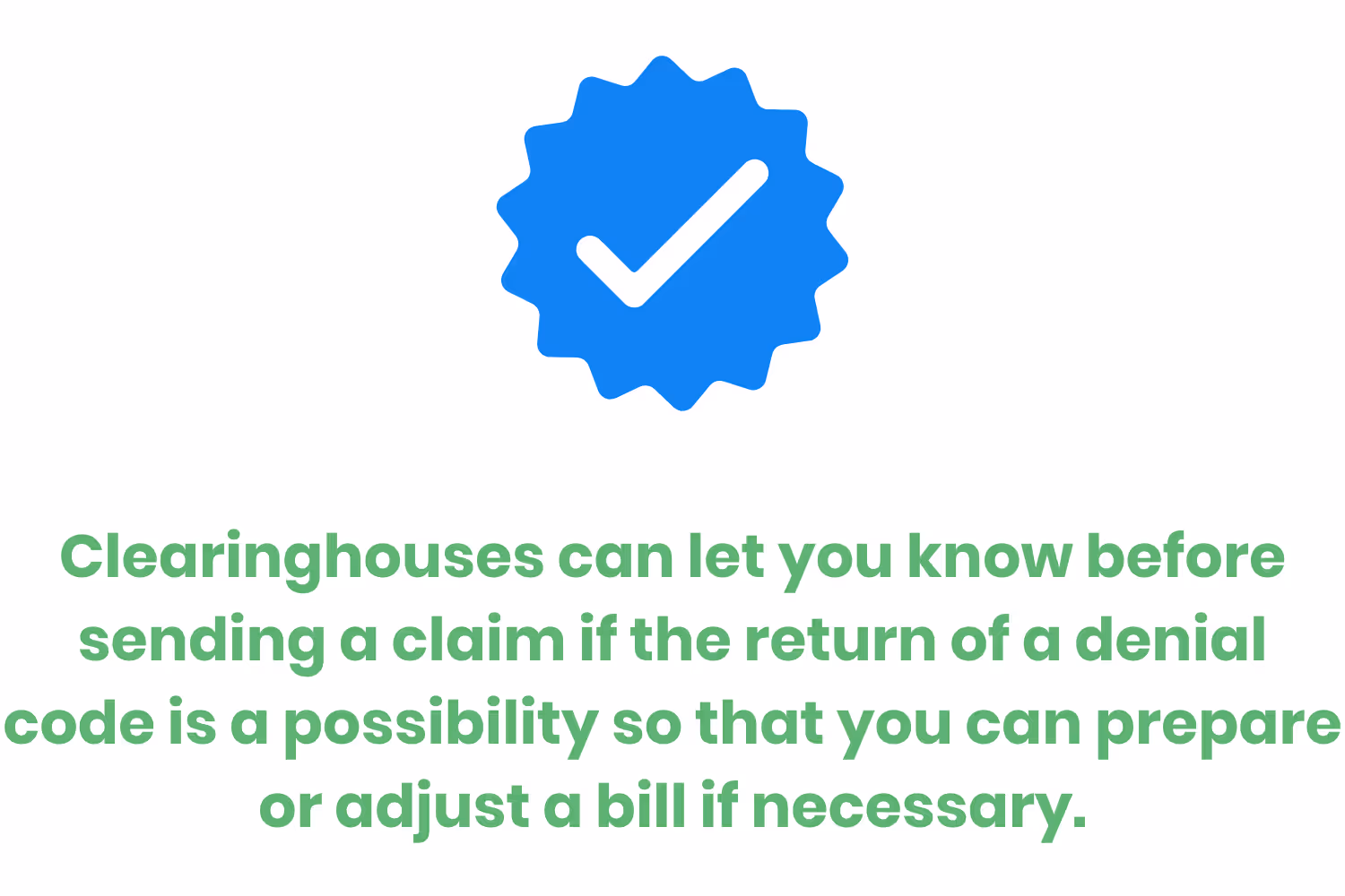 Clearinghouses can let you know before sending a claim if the return of a denial code is a possibility so that you can prepare or adjust a bill if necessary.