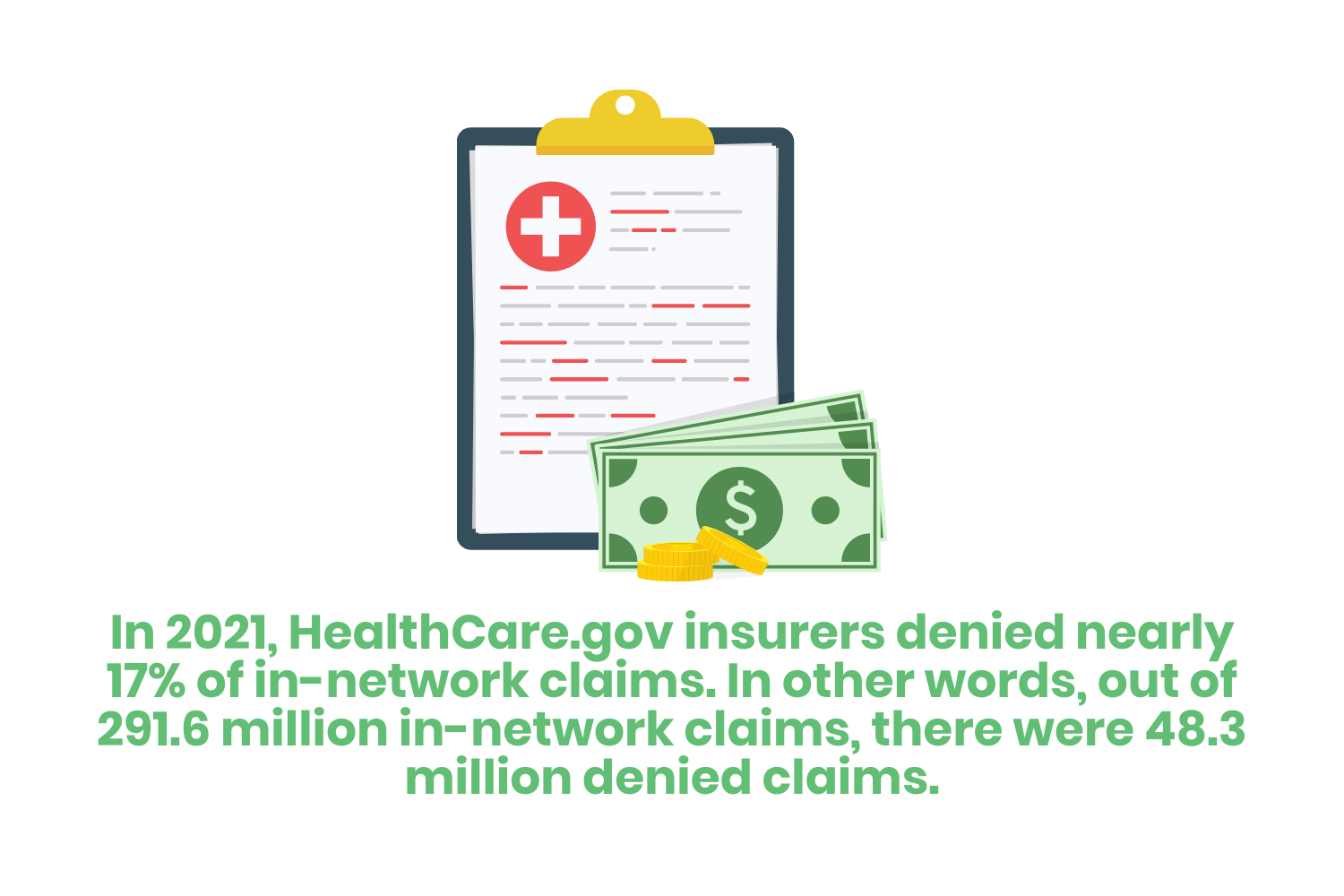 In 2021, HealthCare.gov insurers denied nearly 17% of in-network claims. In other words, out of 291.6 million in-network claims, there were 48.3 million denied claims. That’s a lot of lost revenue. Some insurers even report denying nearly half of in-network claims!