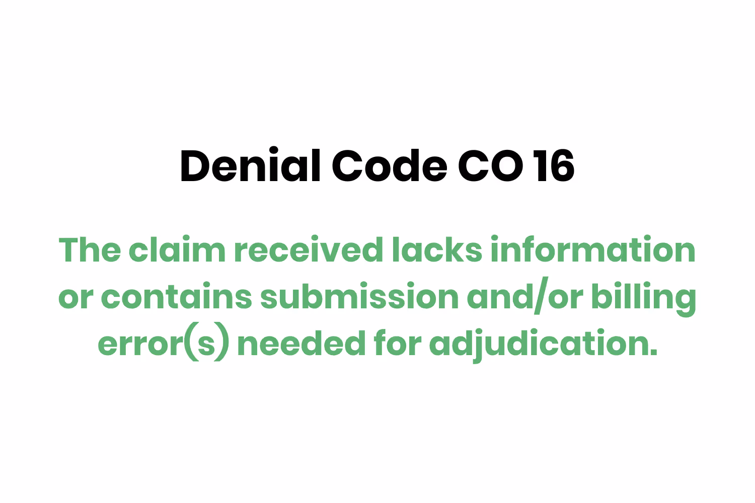 Denial code CO16 means that the claim received lacks information or contains submission and/or billing error(s) needed for adjudication. In other words, the submitted claim doesn’t have what the insurance company wants on it, or something is wrong.