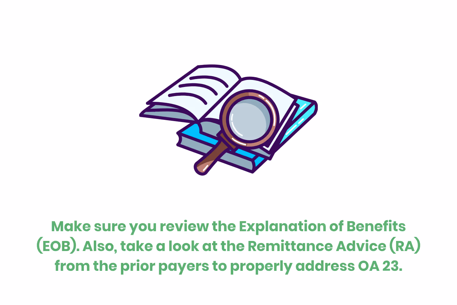 There are a few steps recommended when it comes to addressing denial code OA 23. Today, we are going to cover them all, from start to finish. First, make sure you review the EOB.