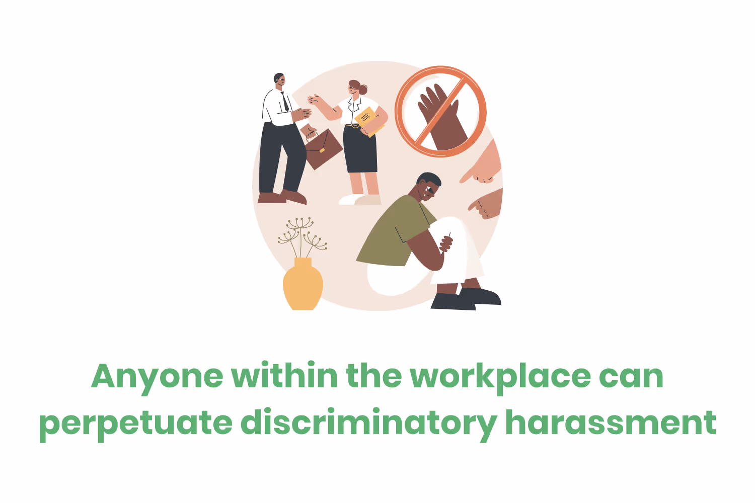 Anyone within the workplace can perpetuate discriminatory harassment. This includes supervisors, co-workers, employees in other departments, or even someone outside the company who has a business relationship with the department.