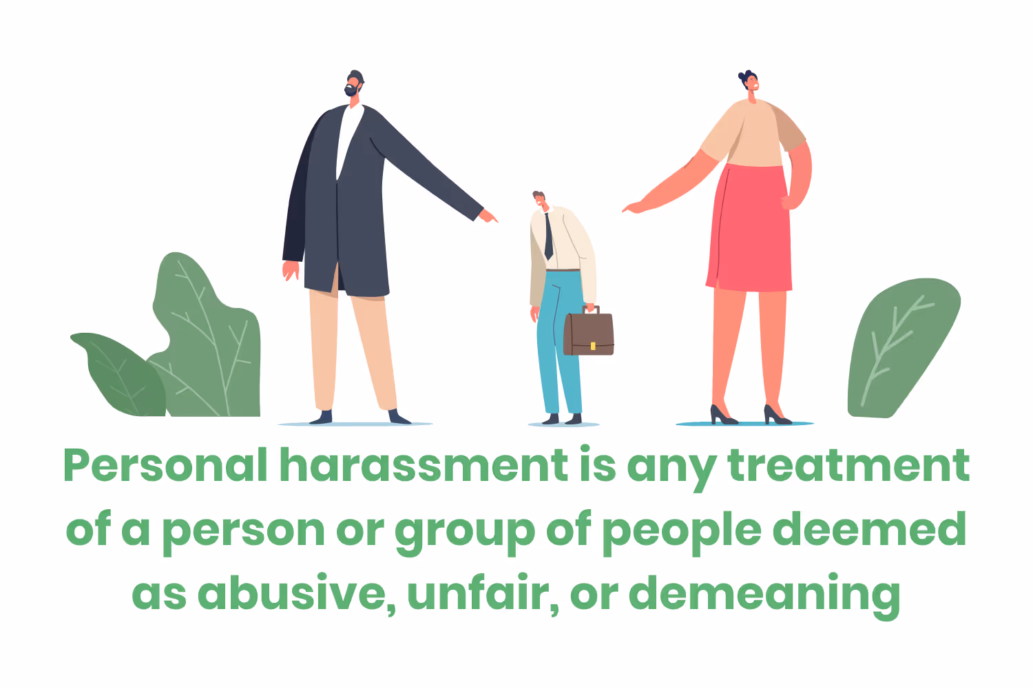 Personal harassment is any treatment of a person or group of people deemed as abusive, unfair, or demeaning. Someone would do this to show the recipient that they are unwelcome or unwanted in the workplace.