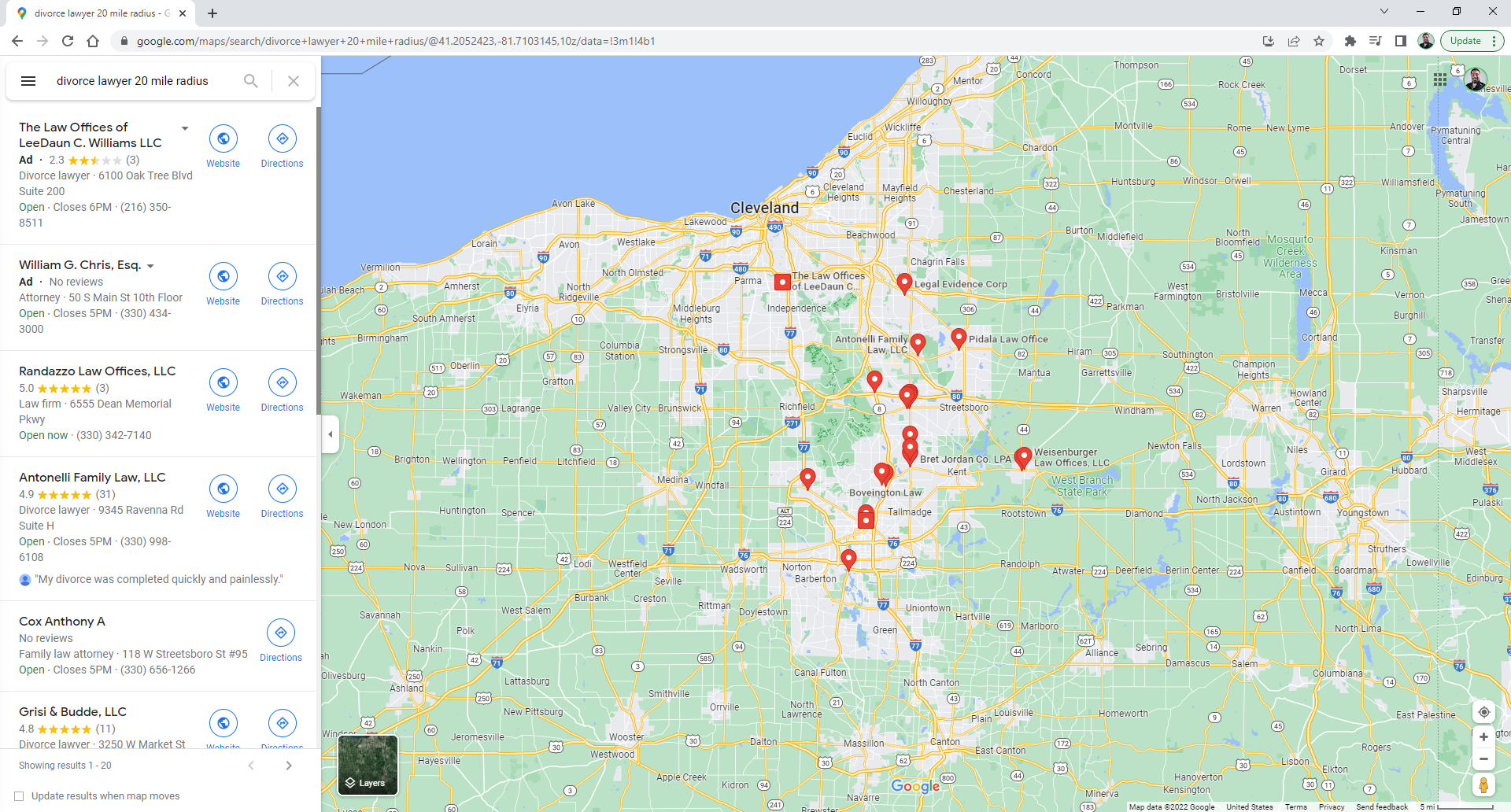 I did a quick search on Google Maps and the image above is what I found. That’s a lot of red dots. If you’re a divorce lawyer near the Cleveland, Ohio area, you have a lot of competition.