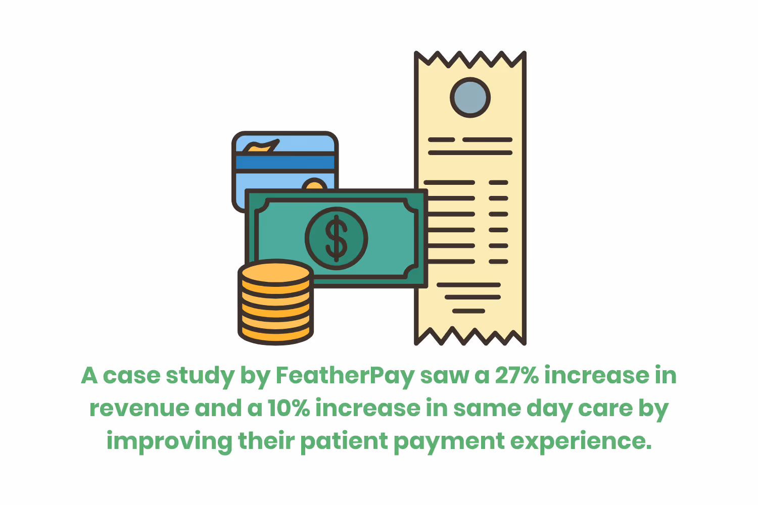 Practices with better payment experience generally see better treatment plan acceptance as well as revenue collections. For example, a case study by FeatherPay saw a 27% increase in revenue and a 10% increase in same-day care by improving their patient payment experience.