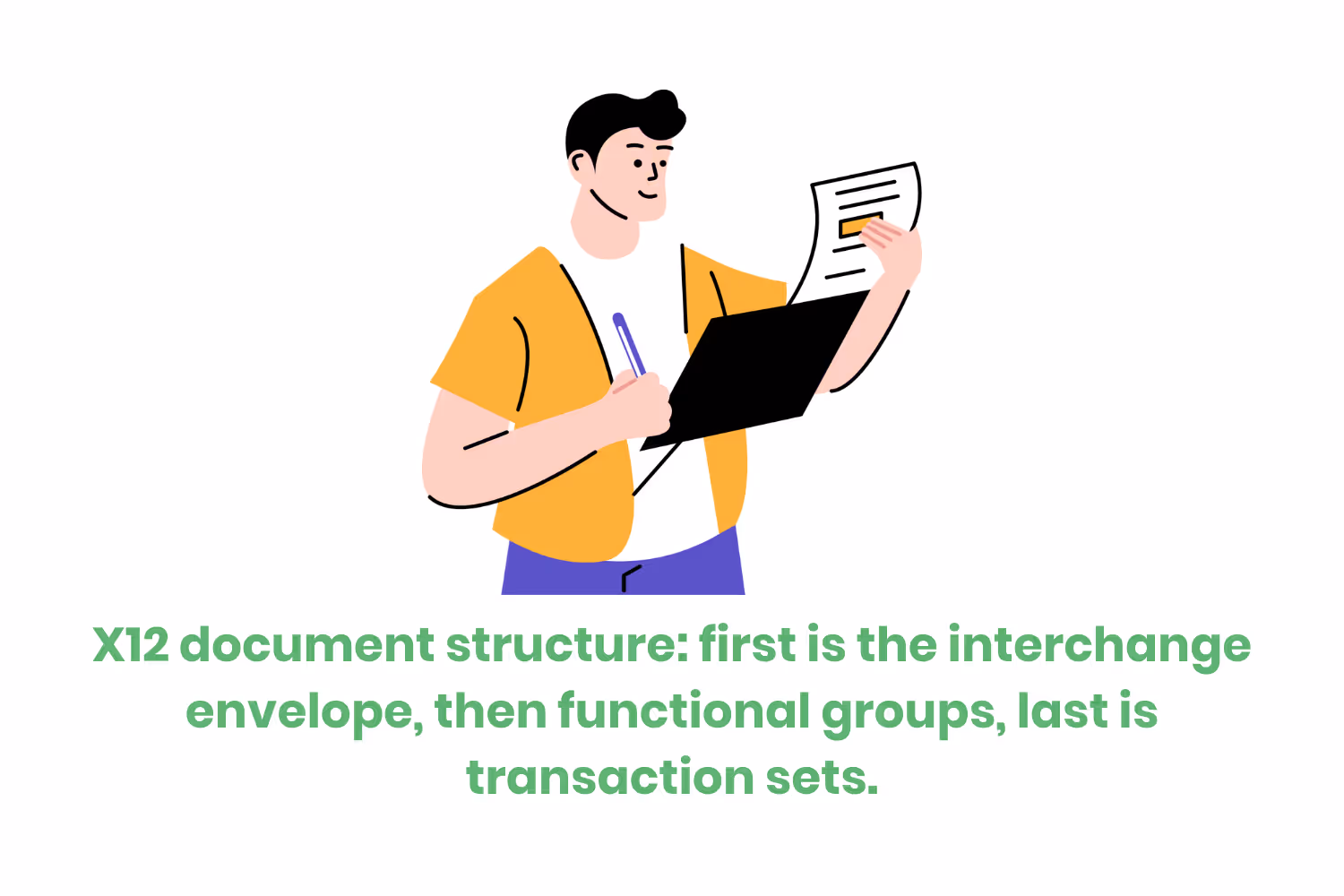 When looking at the X12 document structure, you’ll note the consistency it brings to every industry. It begins with an interchange envelope (ISA/IEA). This is usually followed by one or more functional groups (GS/GE). Then the transaction sets (ST/SE) come after that. These sets each include a transaction set header, data elements within the body, and finally a transaction set trailer. Let’s dissect each of these sections now.