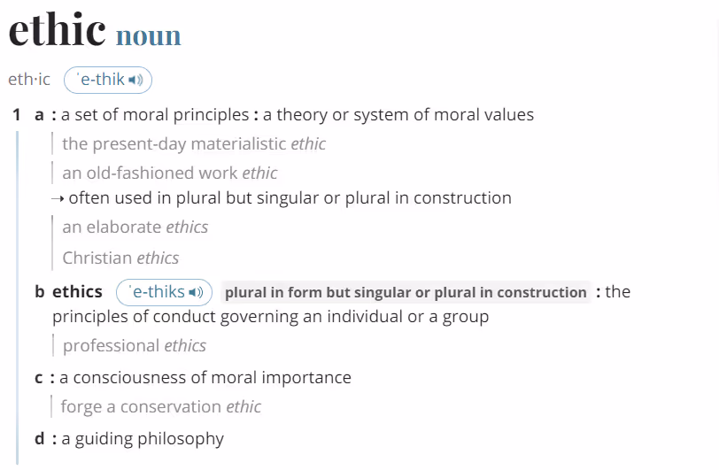 According to the Merriam-Webster dictionary, ethics are a set of moral principles or a system of moral values. Ethics are the principles of conduct governing an individual or group. Think of it as a moral consciousness or guiding philosophy.