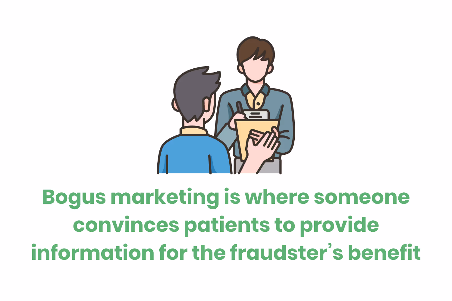 Bogus marketing is a type of healthcare fraud where someone convinces patients to provide information for the fraudster’s benefit (FBI).