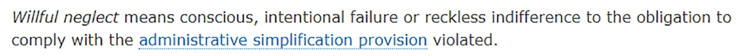 The second category results from a breach that the organization should’ve been aware of, but couldn’t have prevented even with proper due diligence. Since the covered entity couldn’t prevent it, this category doesn’t encompass willful neglect. The Legal Information Institute defines willful neglect as the following…