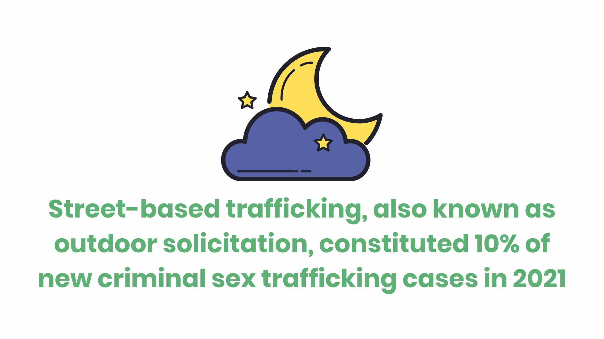 Street-based trafficking, also known as outdoor solicitation, constituted 10% of new criminal sex trafficking cases in 2021. In that same year, the national human trafficking hotline identified 178 cases that fall under this category.