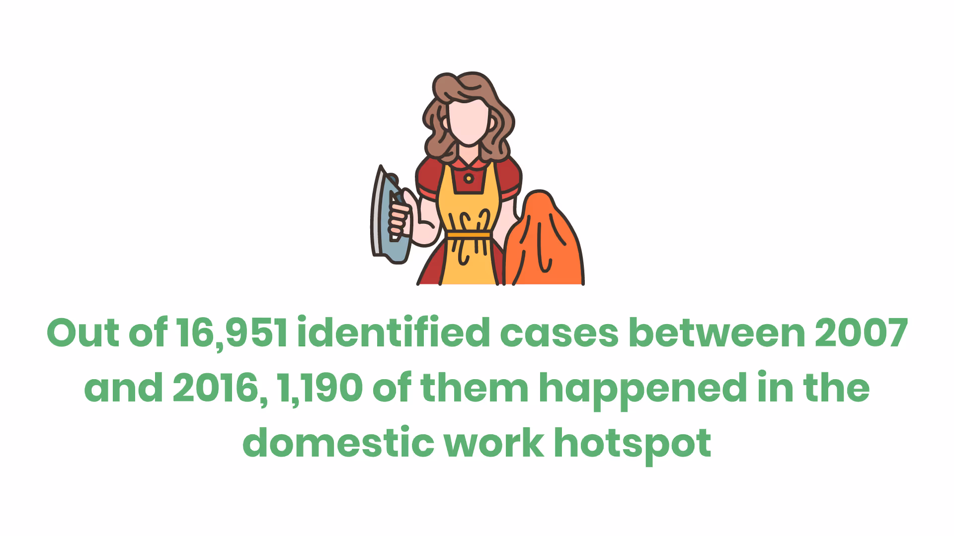 Out of 16,951 identified cases between 2007 and 2016, 1,190 of them happened in the domestic work hotspot. In 2021, there were 185 cases of labor trafficking and another 59 cases that had both labor and sex trafficking elements.