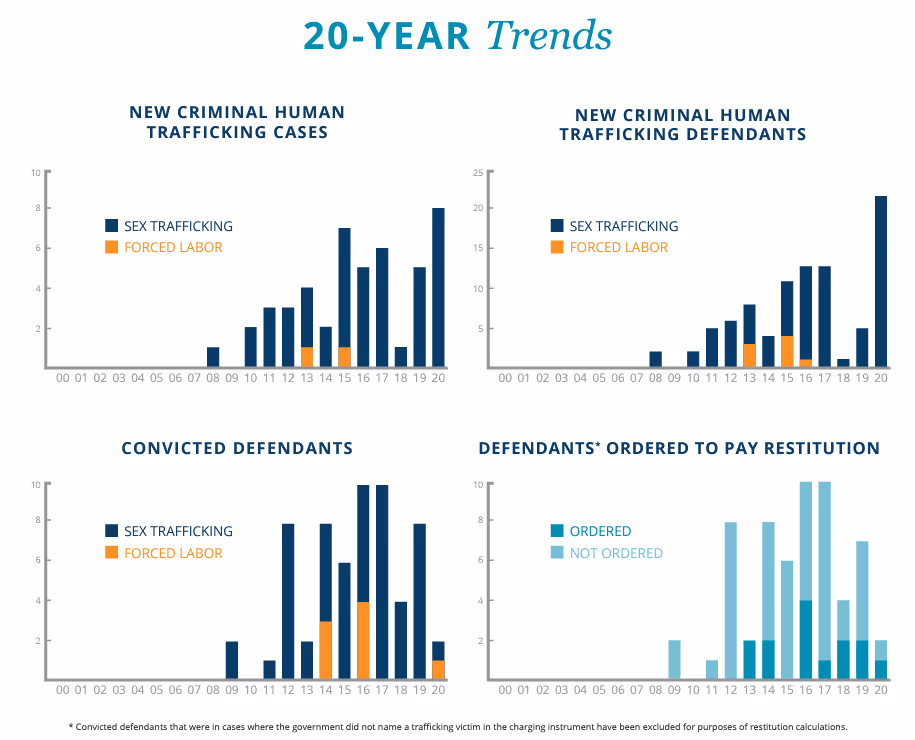 It is important to note that there were four sex trafficking cases charged outside of the Trafficking Victims Protection Act. This means that four people suspected of trafficking a person did go to jail, but not necessarily for the crime of trafficking. Either way, they can’t continue the abuse behind bars, so I’ll consider it a “win” for the public.