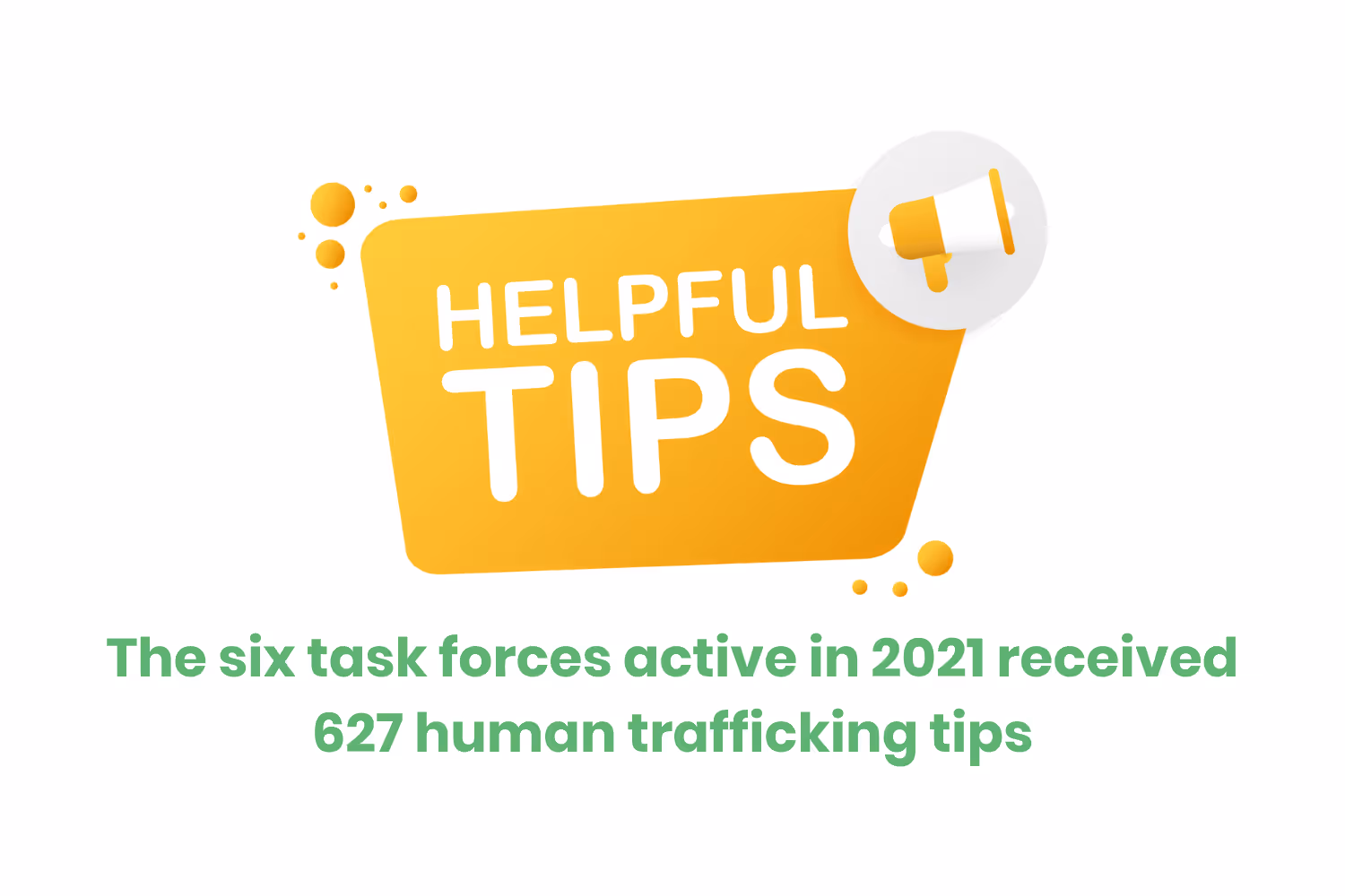 The six task forces active in 2021 received 627 human trafficking tips. In turn, this led to 621 victim interviews and referrals for services. With the help of these tips made by the public, the task forces made many cases and arrests throughout the year.