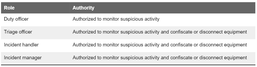 Staff operating within CSIRT roles have the authority to track suspicious activity. Some roles also have the authority to confiscate or disconnect equipment.