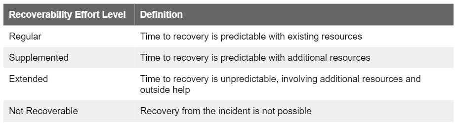 Recoverability Effort of the Incident - categorizes the resources required to recover.