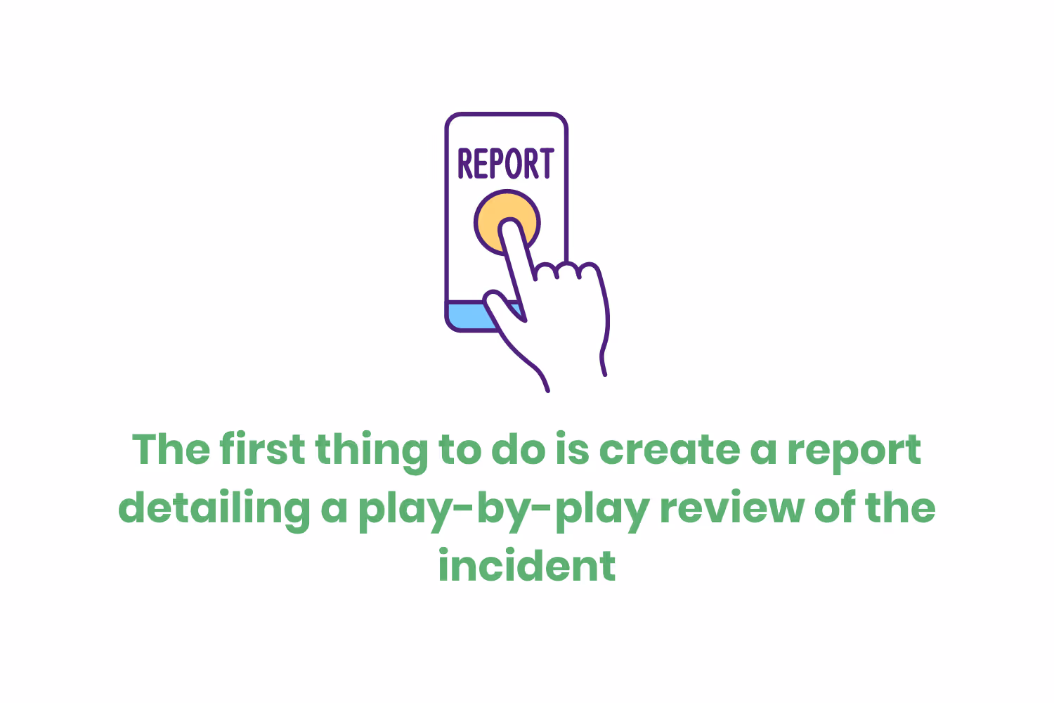 The first thing to do is create a report detailing a play-by-play review of the incident. This report should answer who, what, where, when, and why the situation happened.
