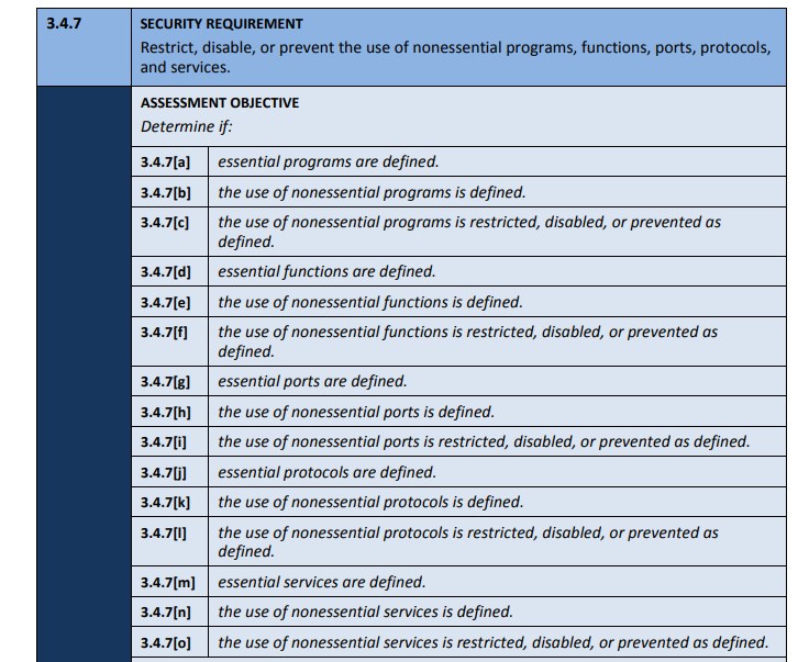 Notice that the security requirement is the same as the control statement from NIST SP 800-171 Rev 2. Below the security requirement is the assessment objective, which in this practice, consists of the 15 determination statements, listed [a] through [o].
