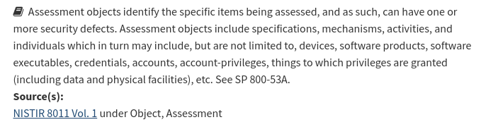 This is a great start to understanding the scope of NIST SP 800-171. Consider this as guidance to defining a boundary. This boundary separates what is relevant to NIST SP 800-171 from what is not. Assessment Objects is a term used by NIST to describe the objects encircled by this boundary.  Let’s look at how NIST defines assessment objects: