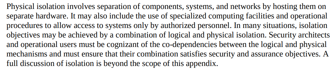 Physical isolation occurs when security domains are not connected (wired or wirelessly). Systems are "air-gapped" if they are not connected and data transfer is only possible through human interaction.