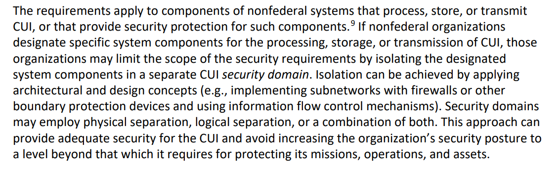 You can create a separate security domain for CUI with physical or logical isolation, or both. Let’s talk about physical isolation first.